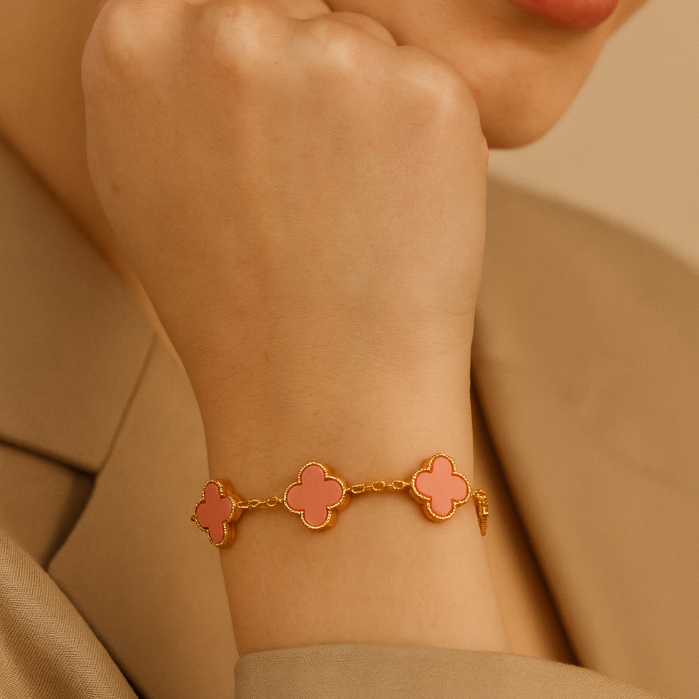 Combineer de Cotton Candy Clover met andere gouden armbanden of een horloge van Lynah voor een speelse, layered pols.